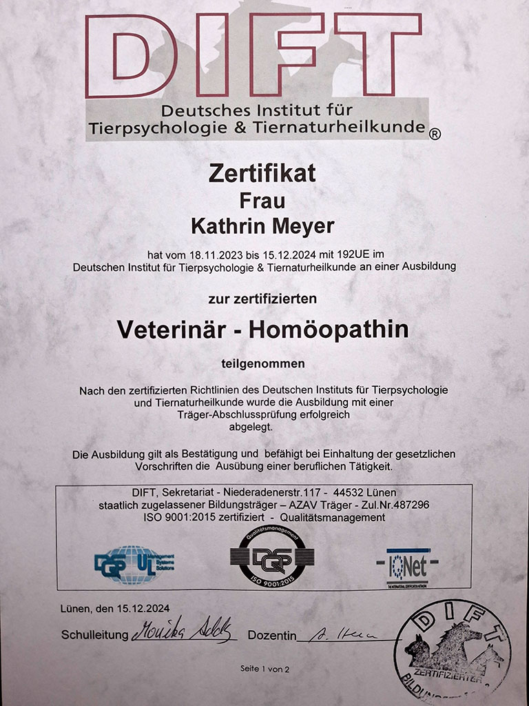 2023-2024 Fachausbildung "Veterinär Homöopathin" (DIFT, Angelika Heese)